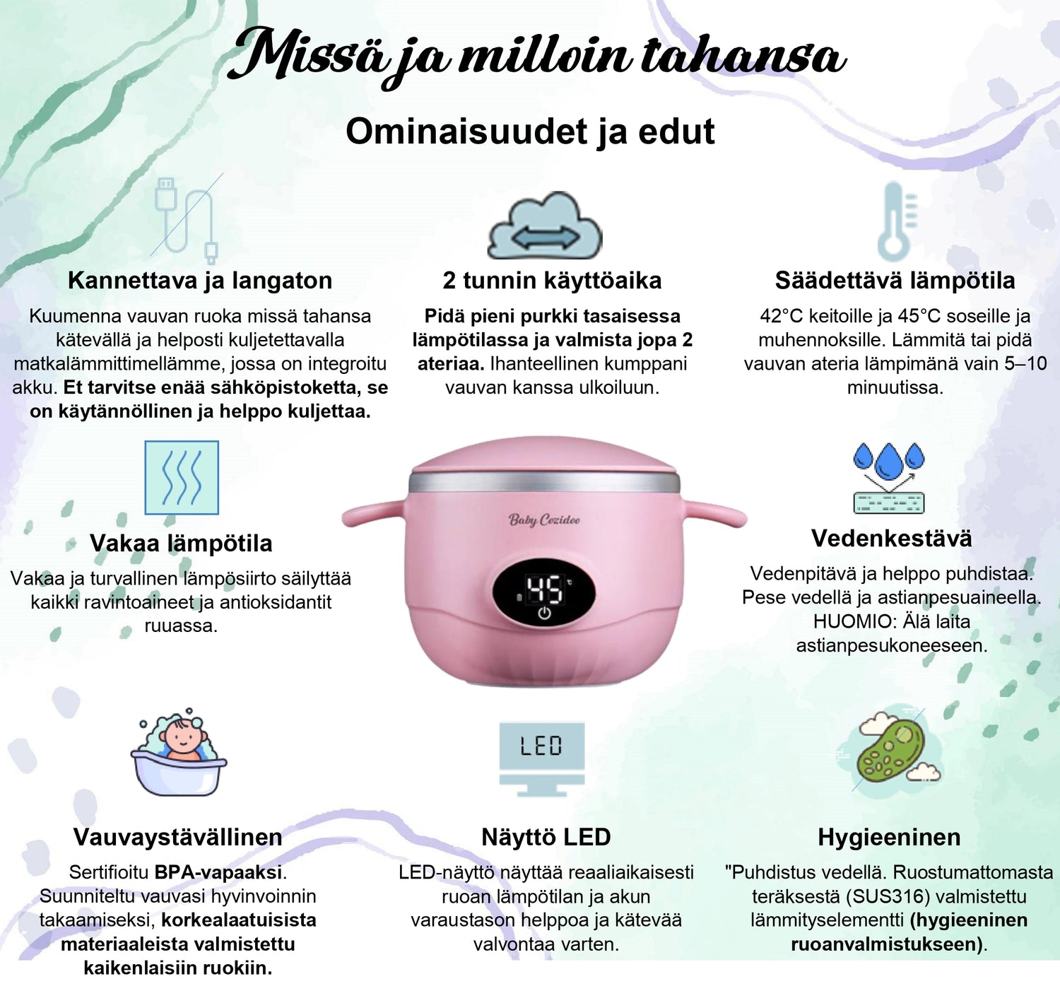 Lämpöpottia on helppo käyttää ja se lämmittää vauvan ruoan optimaaliseen lämpötilaan vain muutamassa minuutissa. Se on kompakti ja helppo kuljettaa mukana, mikä tekee siitä ihanteellisen matkoille tai perheen ulkoiluille. Lisäksi siinä on termostaatti, joka pitää ruoan lämpötilan tasaisena, mikä takaa, että vauvasi ruoka säilyy terveellisenä ja ravitsevana.